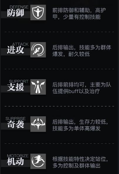 战姬共有5种职业,分别为防御、机动、进攻、奇袭、支援